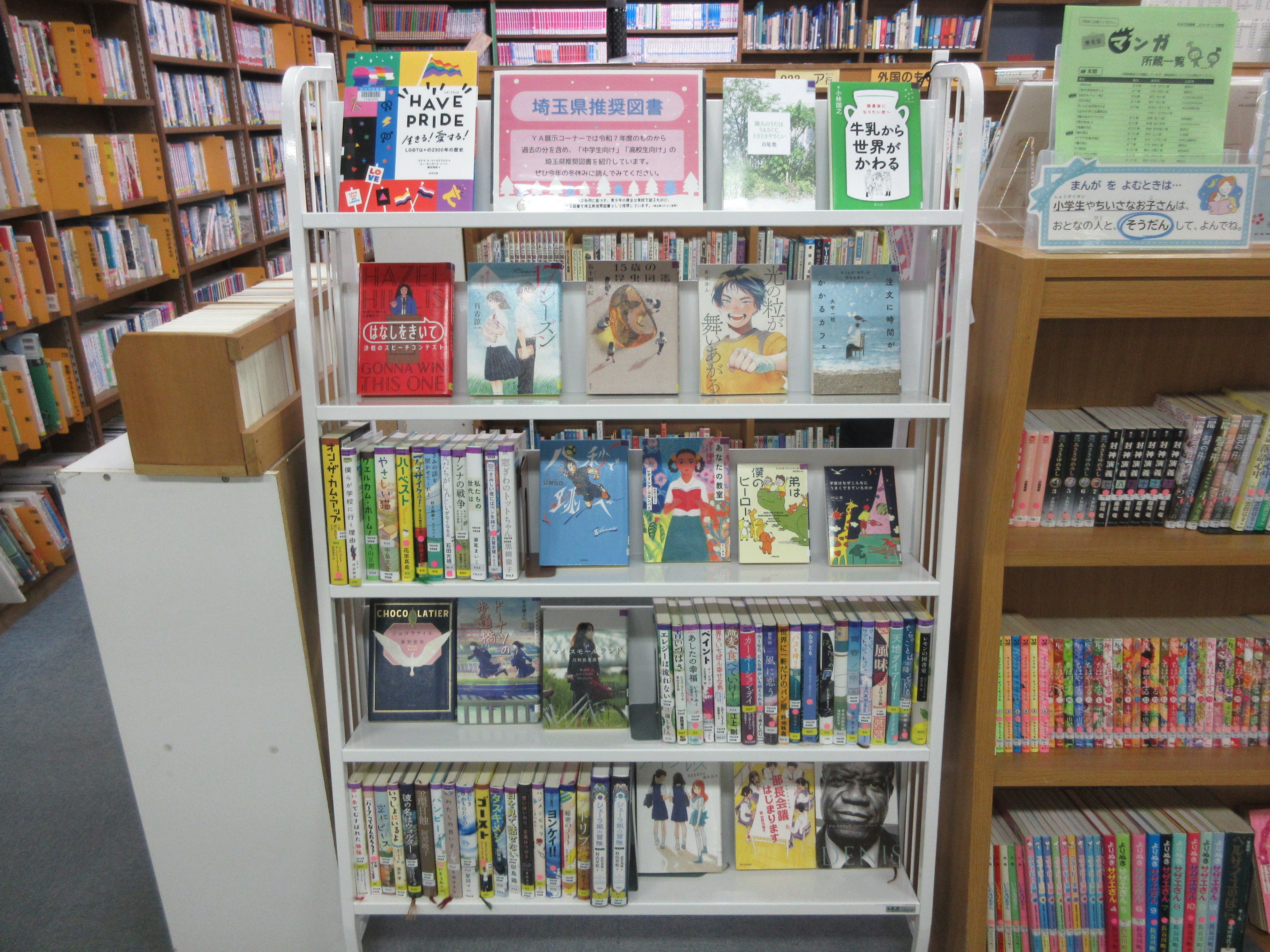 YAコーナーでは、令和7年度のものから過去の分を含め、「中学生向け」「高校生向け」の埼玉県推奨図書の展示をしています。