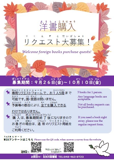 和光市図書館では、年に1度洋書図書を購入しています。購入図書選定の参考とするため、今年も購入希望アンケートを実施いたします。小説だけでなく、実用書や絵本・教材など、さまざまなジャンルの購入を検討しております。また言語も、英語以外の希望も幅広くお受けしたいと考えておりますので、ぜひ和光市図書館の蔵書の充実にご協力ください。