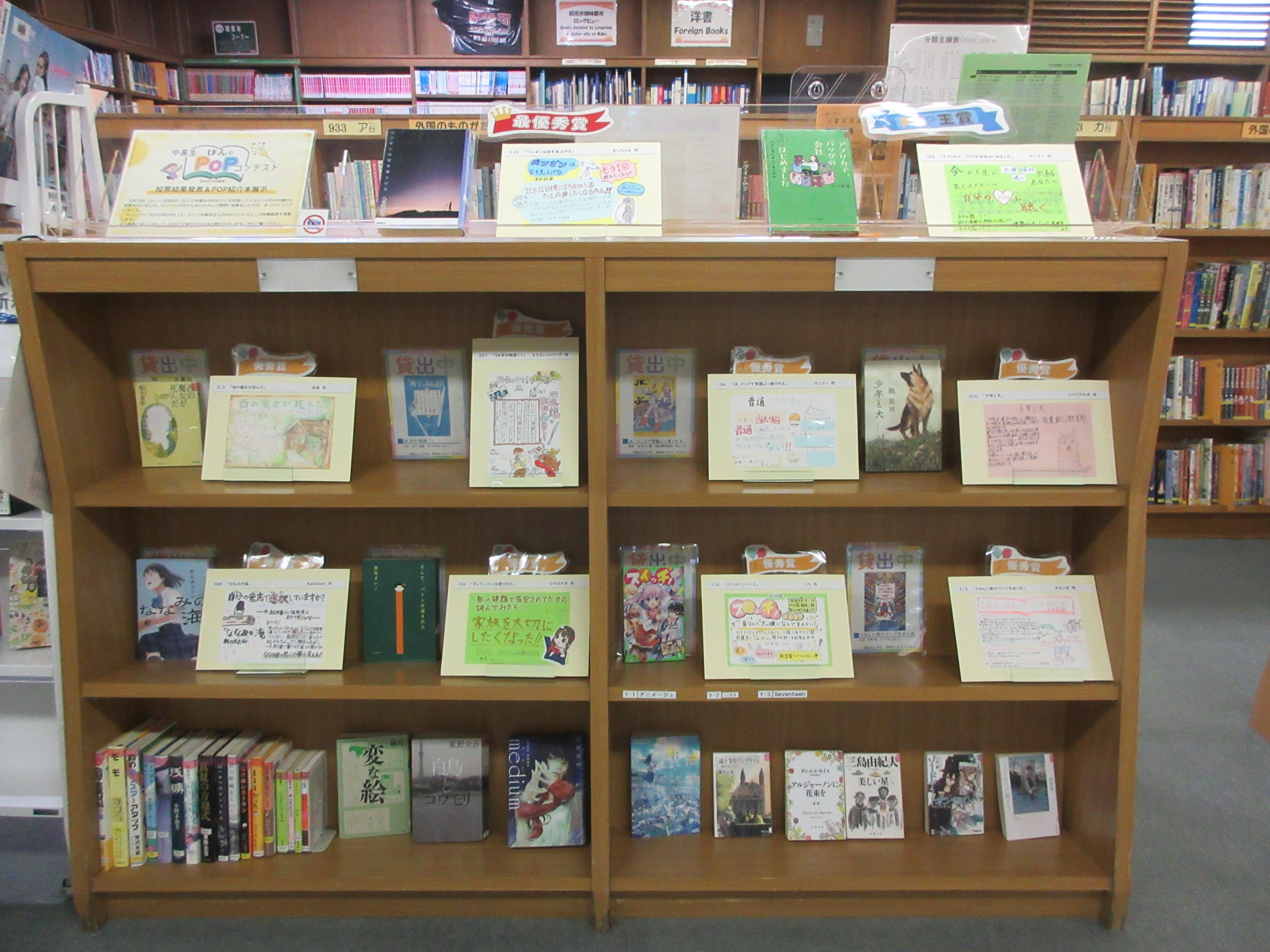 中高生ほんのPOPコンテスト結果発表と応募作品資料の展示をYAコーナーにて実施しています。「最優秀賞」「優秀賞」「POP王賞」に輝いた本はPOPと一緒に飾ってあります。ご応募いただいたみなさま、また投票してくださったみなさま、ありがとうございました。
