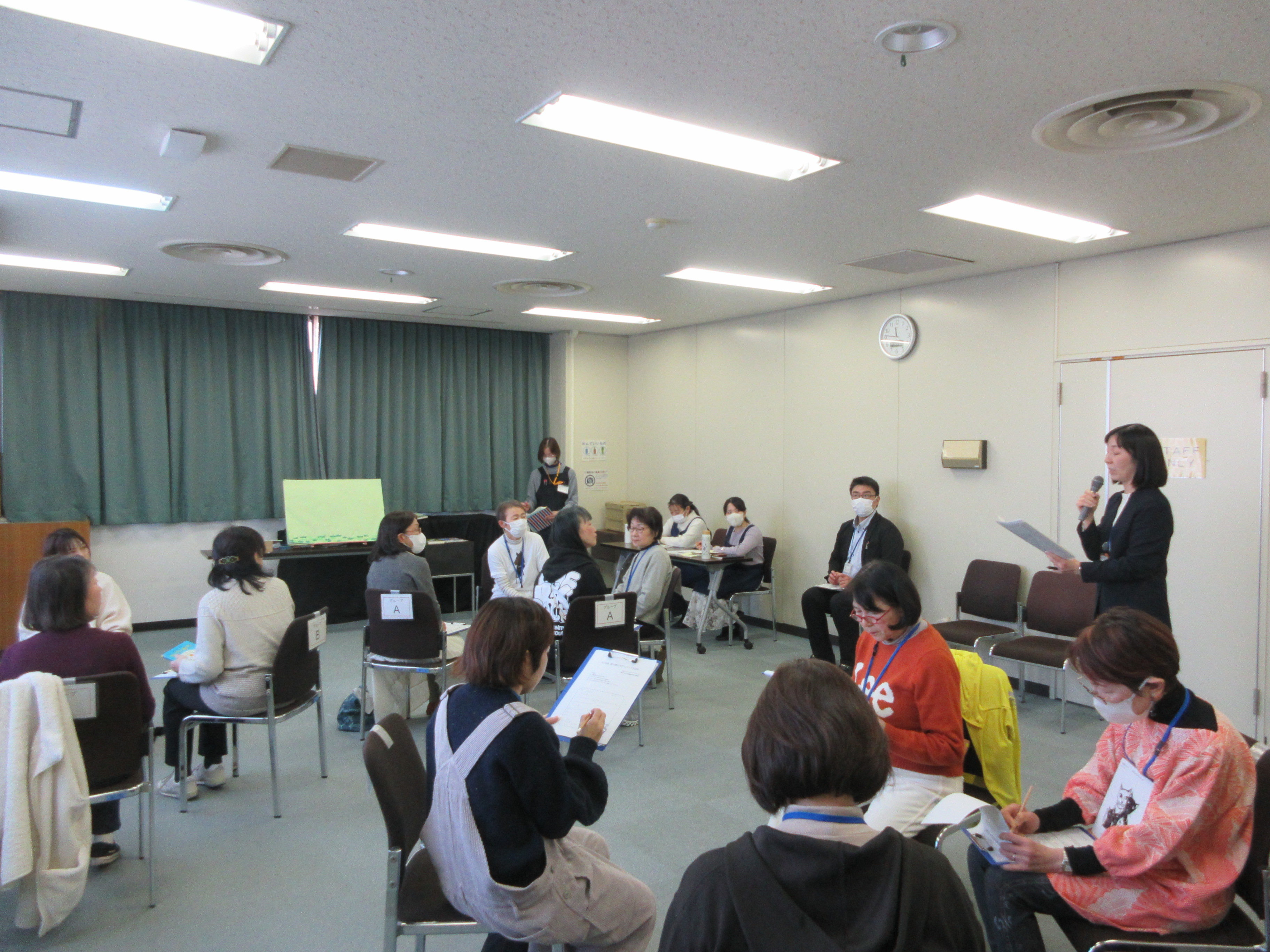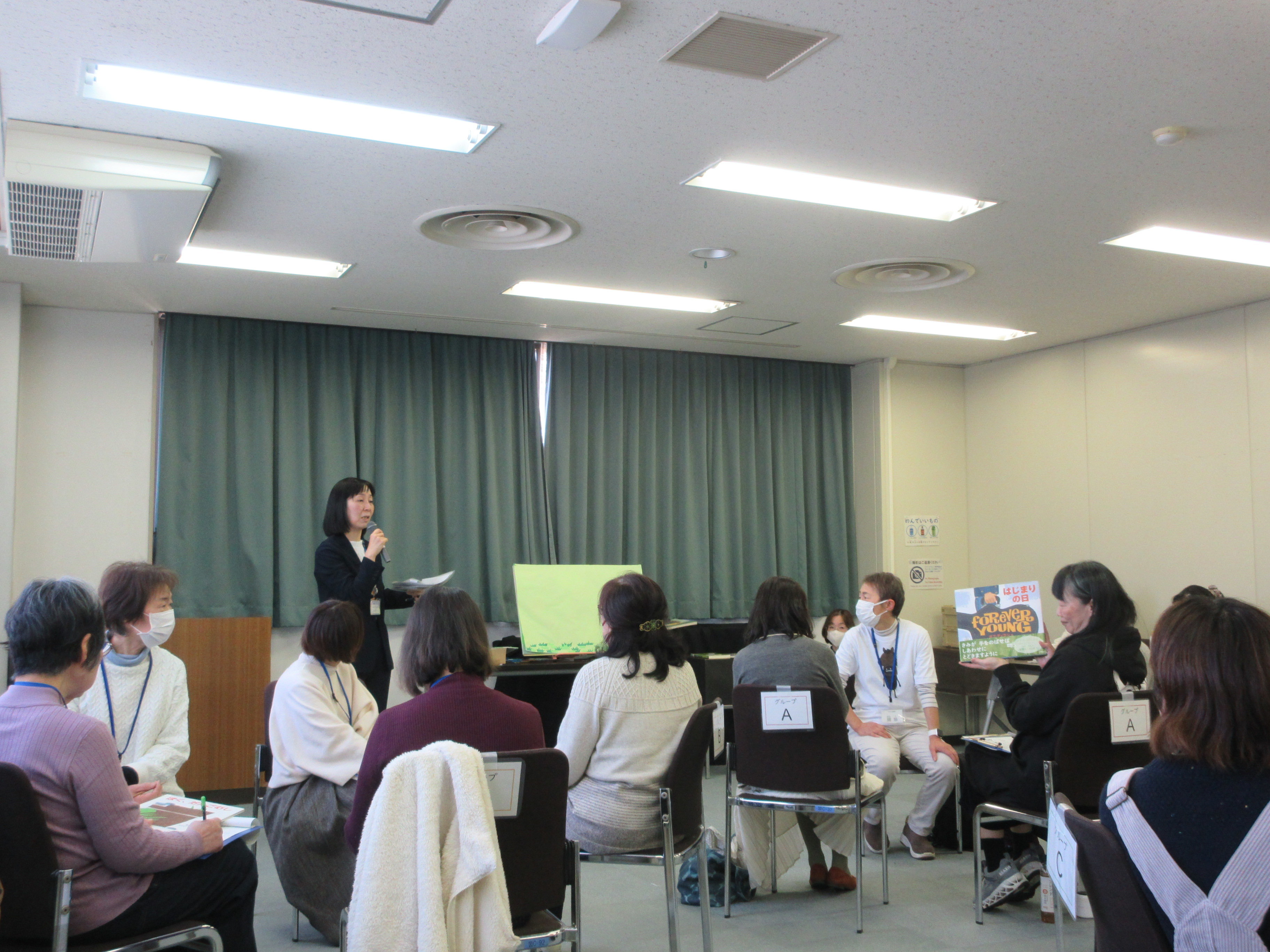 休憩をはさんで後半は、グループごとに読み聞かせに関する意見交換を行い、その内容をグループごとに発表していただきました。