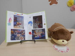 お迎えの日、ぬいぐるみの活動の様子を撮影した写真でアルバムを作成しました。写真をじっくり見てぬいぐるみが過ごした時間を想像しながら工夫を凝らし、素敵な作品が出来上がりました。
