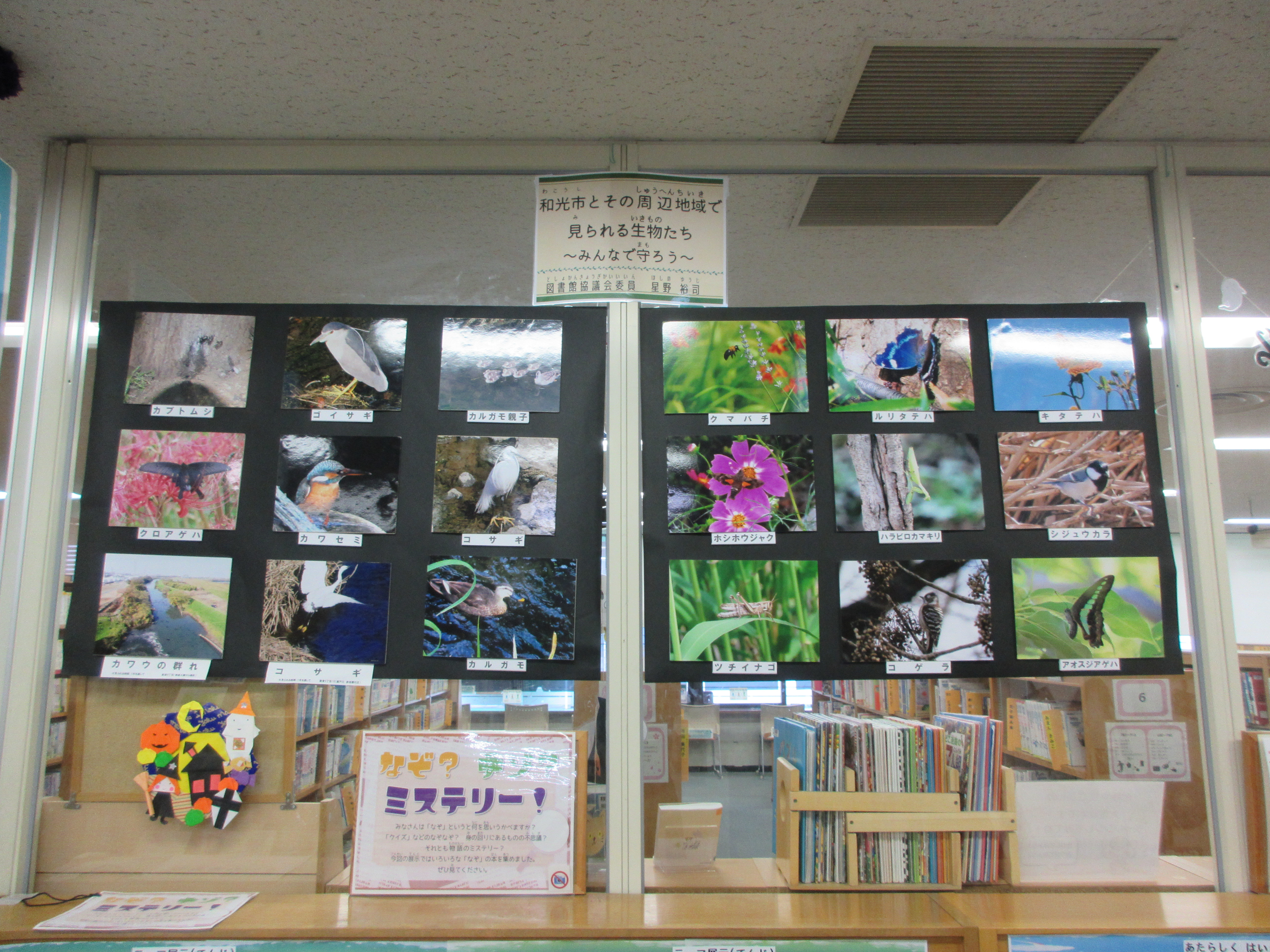 図書館協議会委員の星野裕司さんが撮影した色とりどりの綺麗な生き物の写真を展示しました。